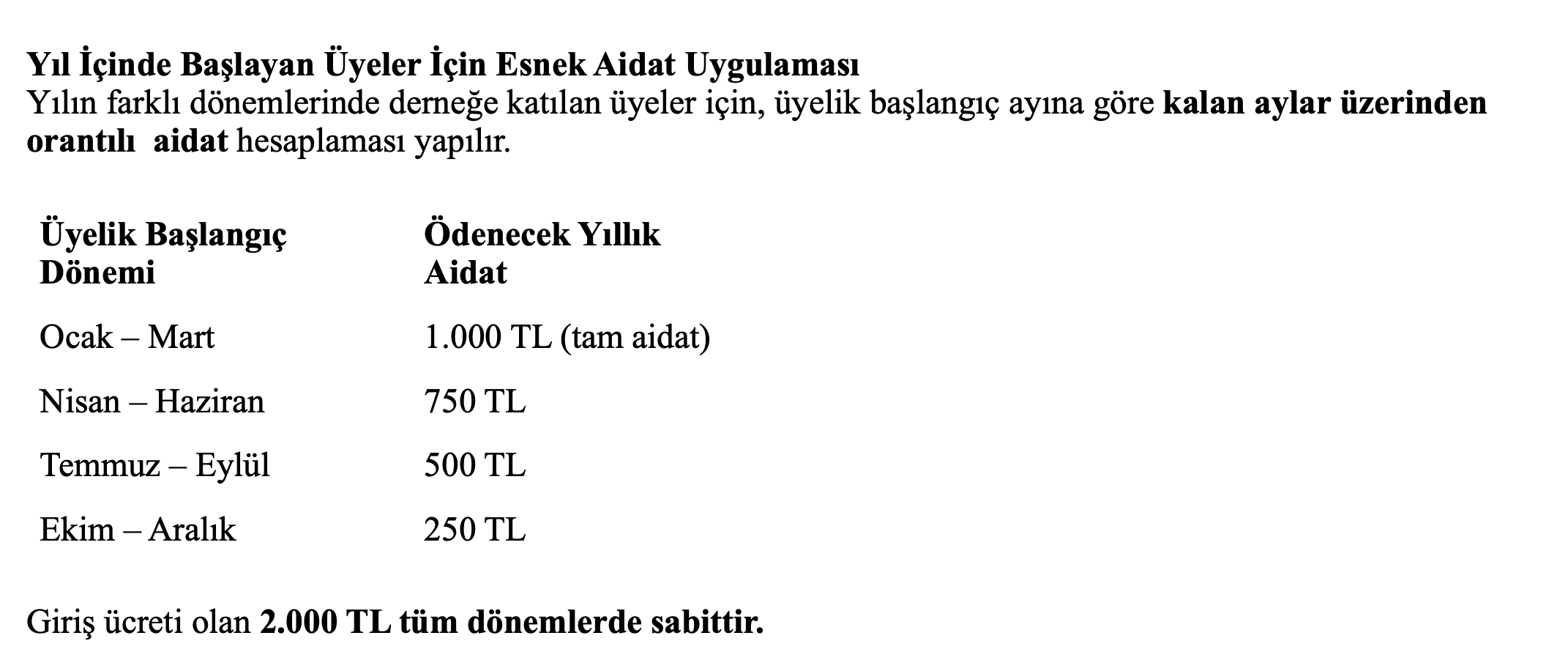 Bireysel Üyelik Ücretleri;